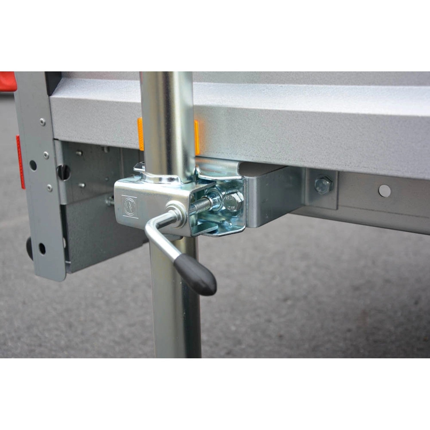 Nachdem die Abstellstützen seitlich am Anhänger befestigt sind, wird ein sicherer Stand des Anhängers während der Beladung erzielt. Das an der Deichsel befestigte Stützrad macht ein leichtes Rangieren des Anhängers Basic 750 möglich.