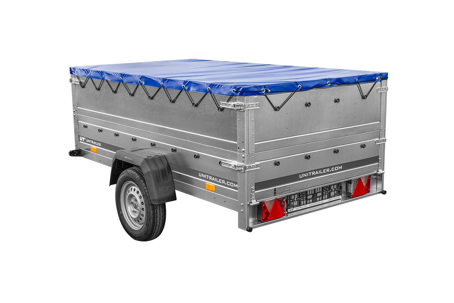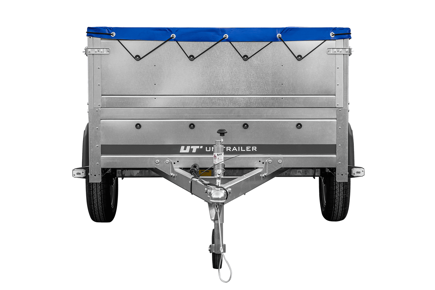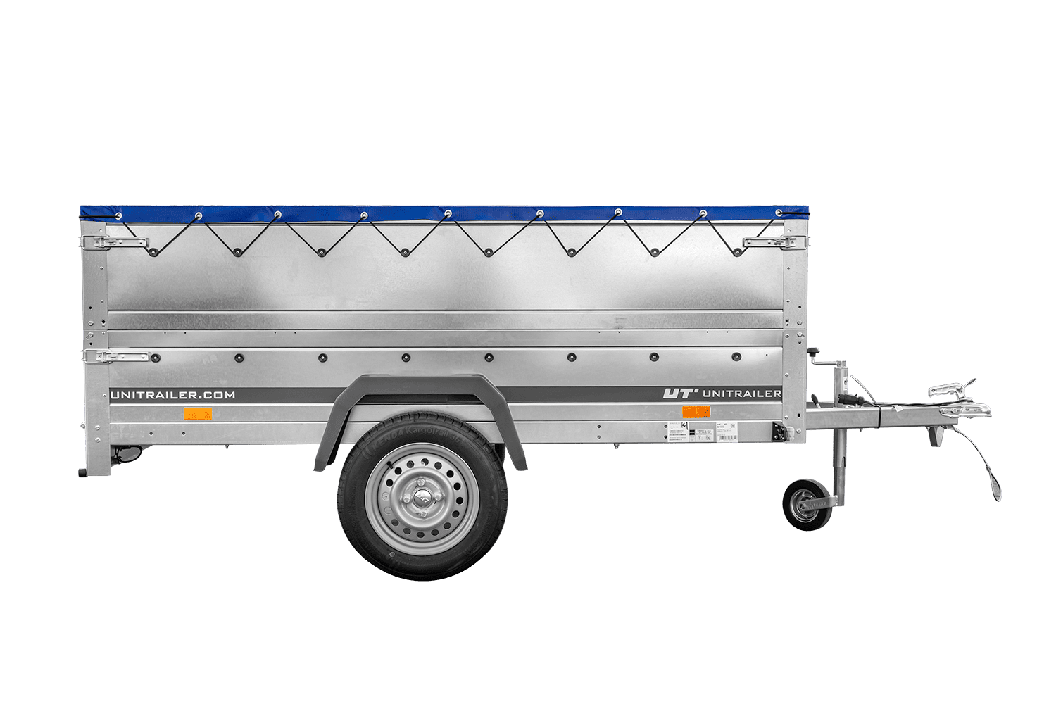 Unitrailer GARDEN TRAILER 230 FD Pkw-Anhänger mit Stützrad, zusätzlichen Bordwänden und blauer Plane