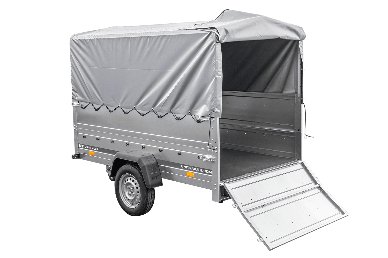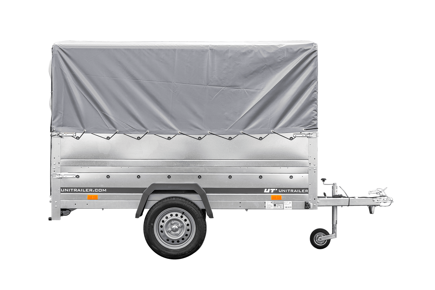 - Das Set beinhaltet ein Stützrad mit Klemme, zusätzliche Bordwände, einen 80 cm hohen Stahlrahmen und eine passende Doppelschrägplane,