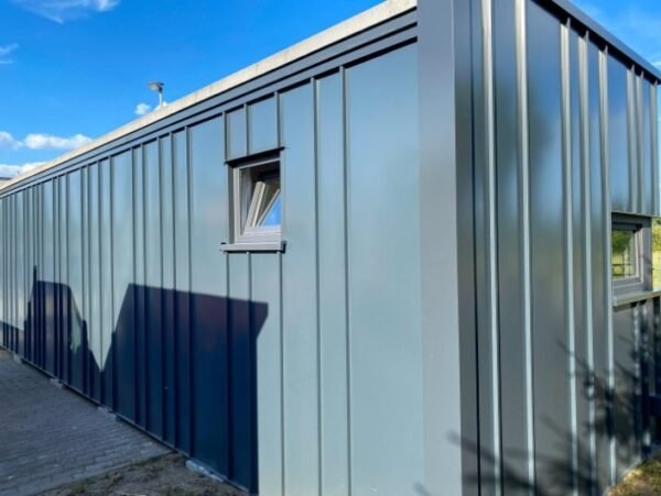 - – Außenwände: 150 mm Polystyrol-Sandwichplatten (innen Gips, außen Blechverkleidung)