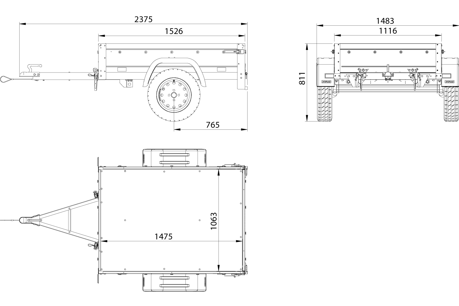 - FAHRGESTELL – Lenkachse vom Hersteller Knott oder ALKO – auf Bestellung von Unitrailer gefertigt. Raddimensionen: 155/70 R13. Die V-förmig neigbare Deichsel kann jederzeit unter den Anhängerboden geklappt werden.