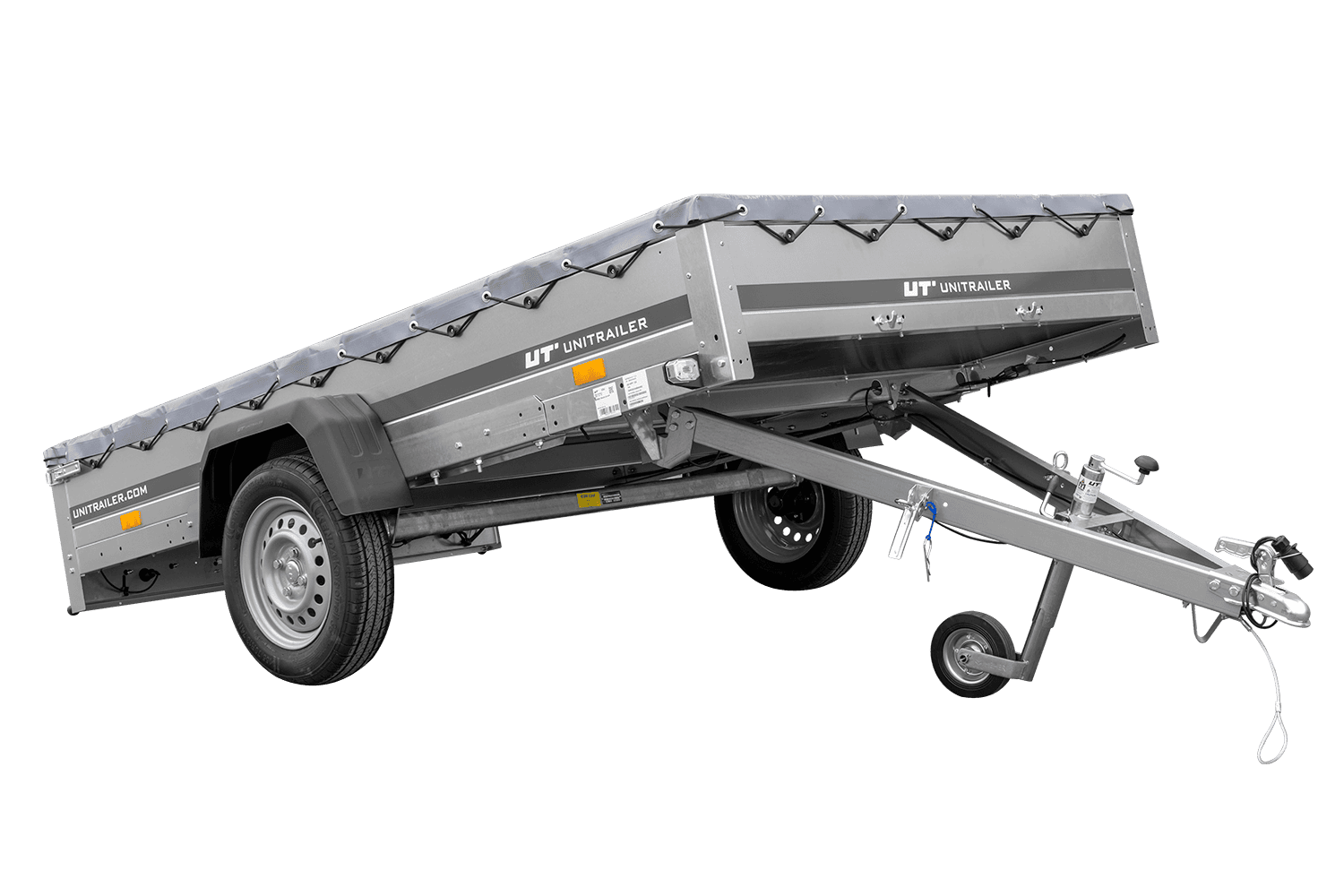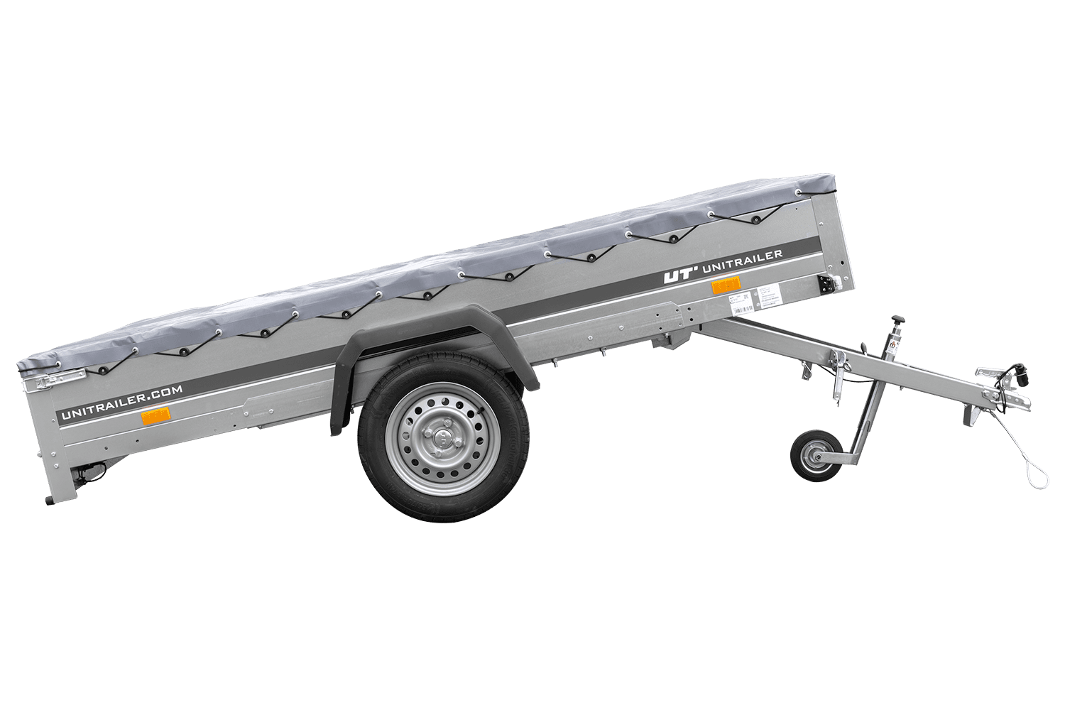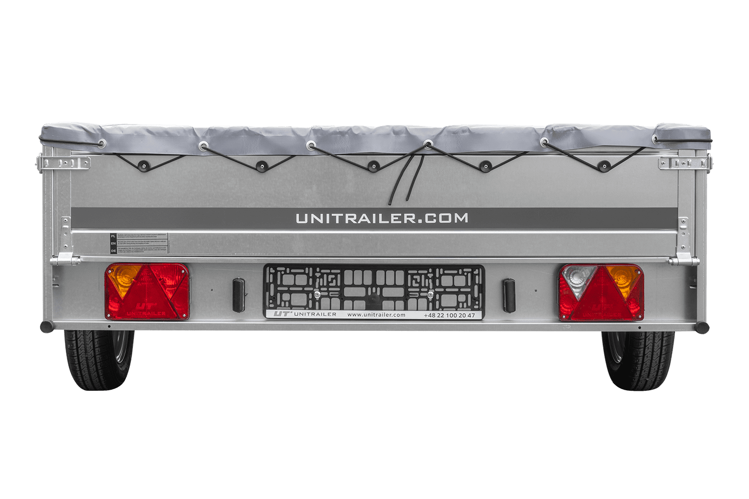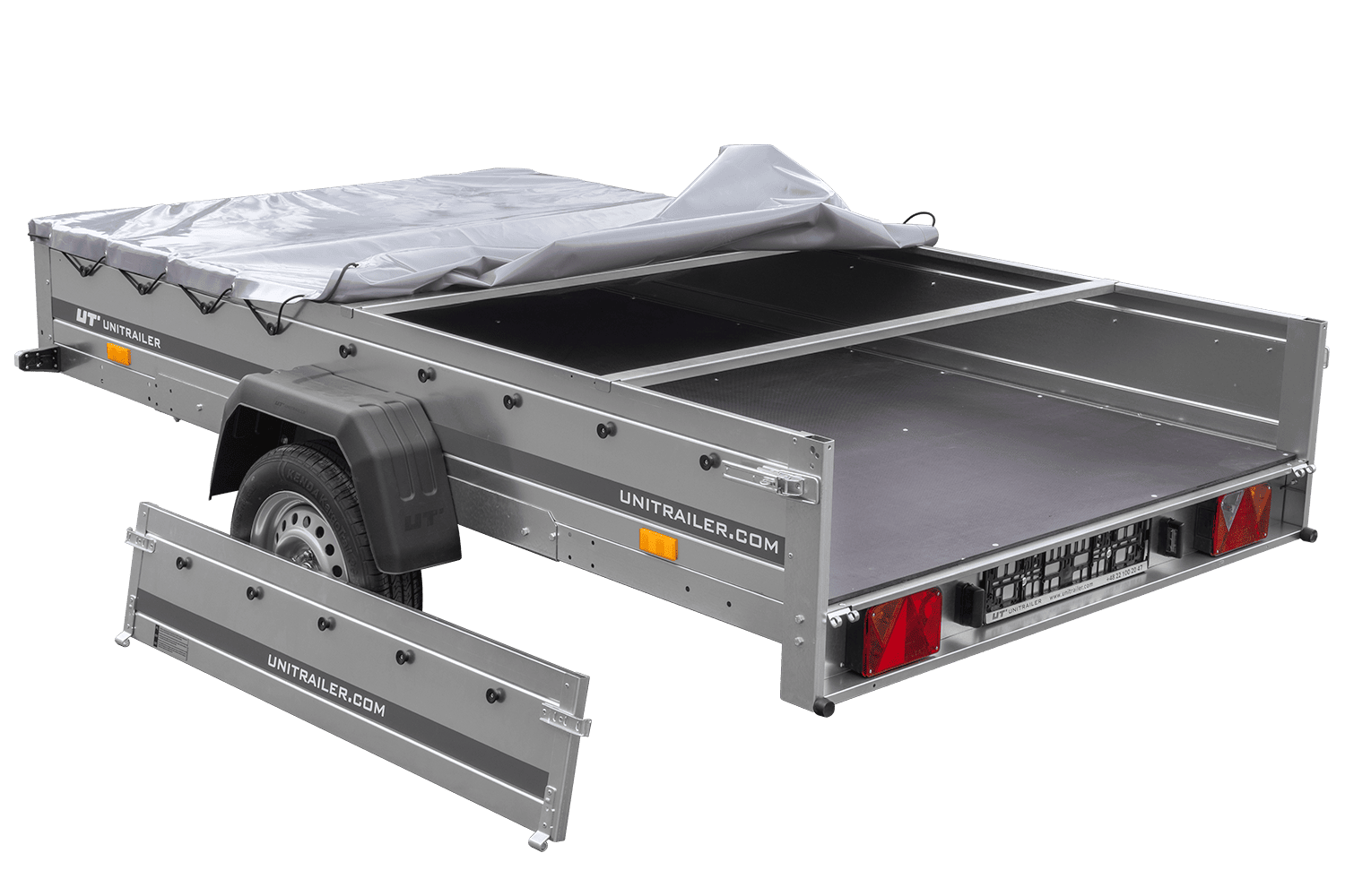 Der Anhänger mit zusätzlichen Seitenwänden, Flachrahmen und grauer Plane ist ein Einachsanhänger mit einem maximalen zulässigen Gesamtgewicht bis 750 kg . Um das Be- und Entladen zu erleichtern, verfügt der Anhänger über die Möglichkeit, die Heckseite zu öffnen bzw. abzunehmen. Die graue Plane schützt die Ladung wirksam vor Niederschlag und Sonneneinstrahlung und der flache Rahmen verhindert, dass die Abdeckung unter der Last von Regen oder Schnee nach innen zusammenfällt. Die Plane besteht aus dickem, wasserdichtem Das Material hat ein Gewicht von 630 g/m² und selbst lang anhaltender Regen führt nicht zu Undichtigkeiten.